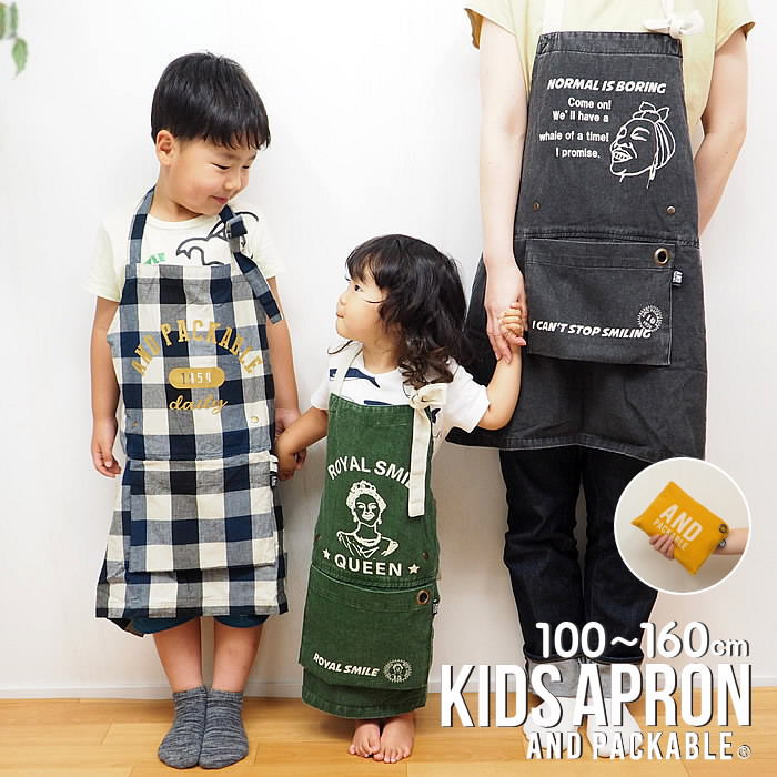 小さな子も大きな子もお揃いに!サイズ調節OKのおしゃれなエプロン ・Spec 商品名 AND PACKABLE キッズエプロン ロイヤルGR素材 綿100%サイズ 身長100〜160cm サイズ調節可 着丈約68cm(身長130〜160cm対応) スナップを留めた状態:着丈約58cm(身長100〜130cm対応) 身幅:約74cm 三角巾:約51×51cm 重さ:エプロン約250g バンダナ約40g洗濯表記 洗濯により色落ちしますので、必ず単独洗いをしてください。