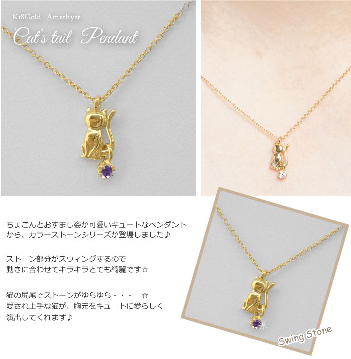 【P5倍】18K K18ゴールド ネコ 猫 スウィング アメジスト ネックレス キャット ペンダント k18WG YG PG 誕生石 誕生日 プレゼント ギフト 自分ご褒美【送料無料】