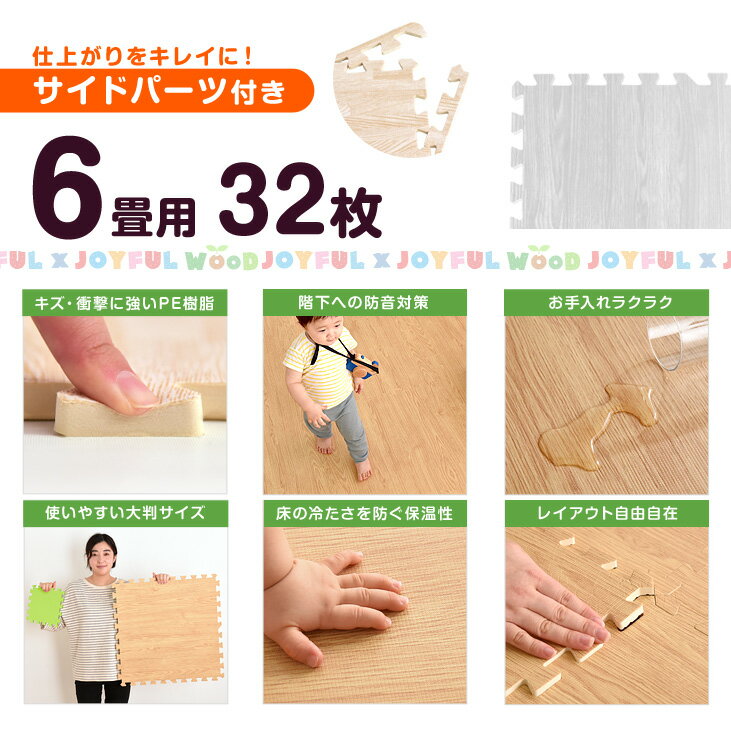 木目調 ジョイントマット 大判 59cm 6畳 32枚 単色 防音 木目 洗える カーペット ベビー フロアマット 床暖房対応 プレイマット カーペット マット 抗菌 防臭 ジョイントマット サイドパーツ付 赤ちゃん パズルマット おしゃれ おすすめ