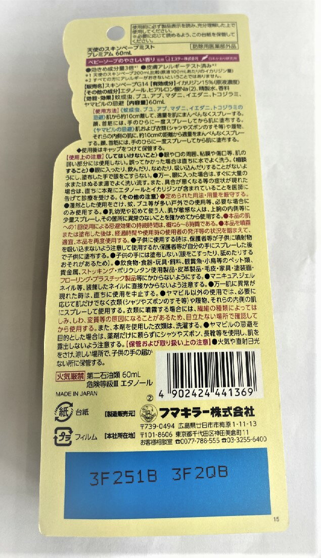 商品名:フマキラー 天使のスキンベープ ミスト プレミアム 60mL内容量:60mlJANコード:4902424441369発売元、製造元、輸入元又は販売元:フマキラー原産国:日本区分:防除用医薬部外品商品番号:101-95156●虫よけ成分イカリジンを採用!●虫よけ効果長持ち!イカリジン15%!●ミストタイプだから、舞い散り少なく吸い込みにくい●肌にやさしいヒアルロン酸ナトリウム(ヒアルロン酸Na)配合【成分】有効成分・・・イカリジン15%(原液濃度)その他の成分・・・エタノール、ヒアルロン酸Na(2)、精製水、香料【注意事項】・定められた用法・用量を厳守する。